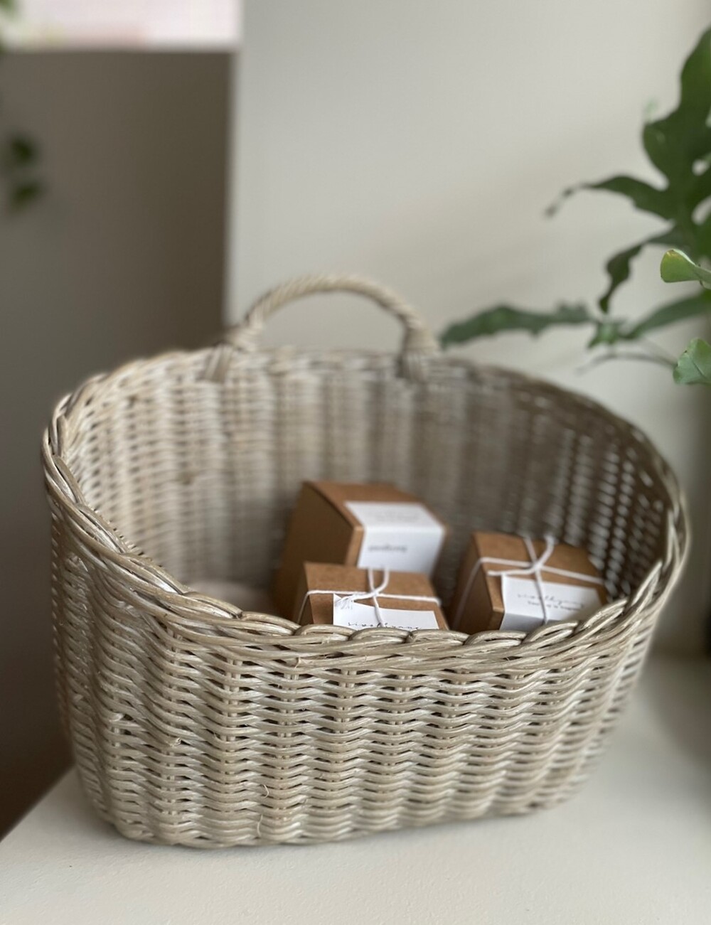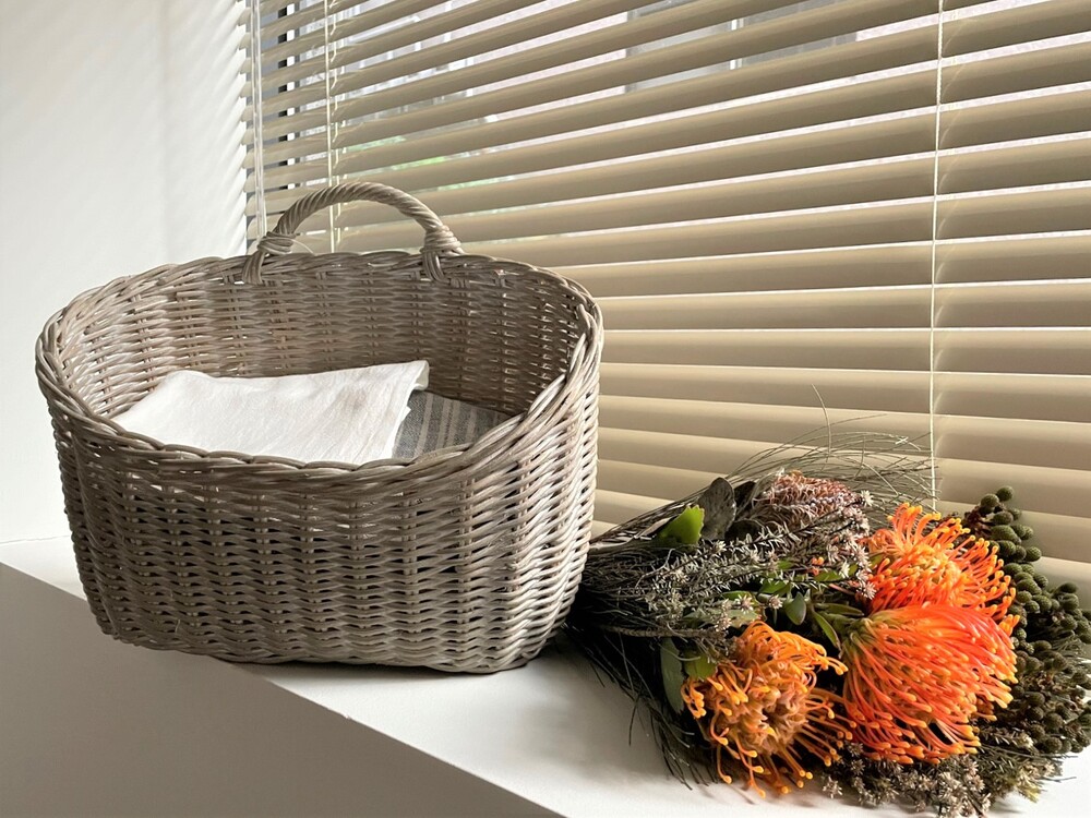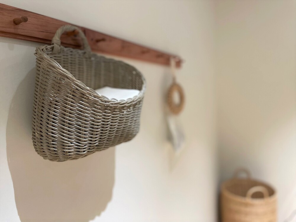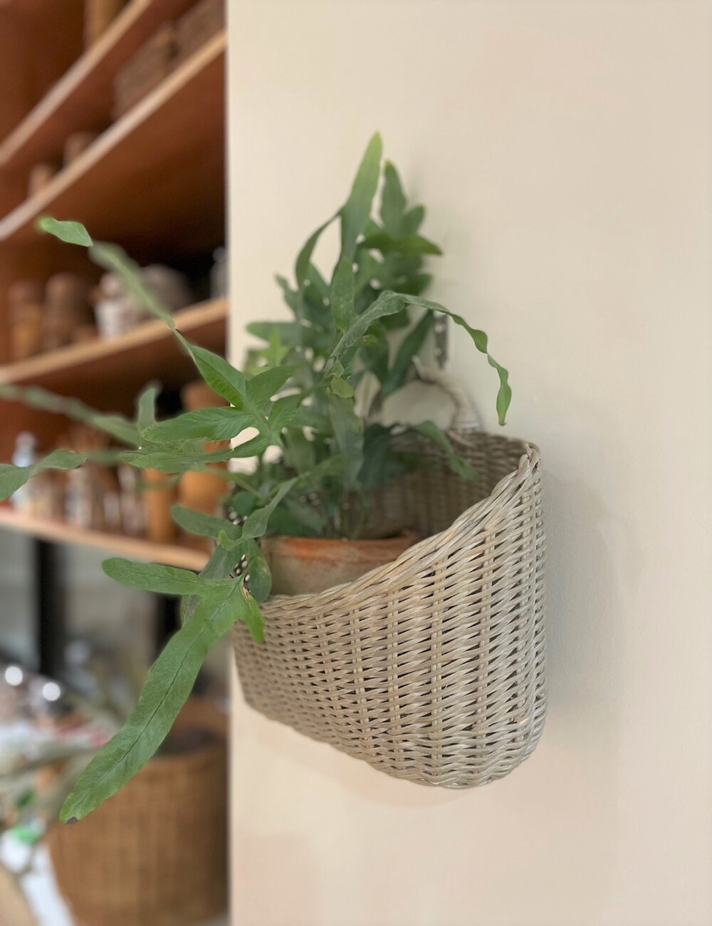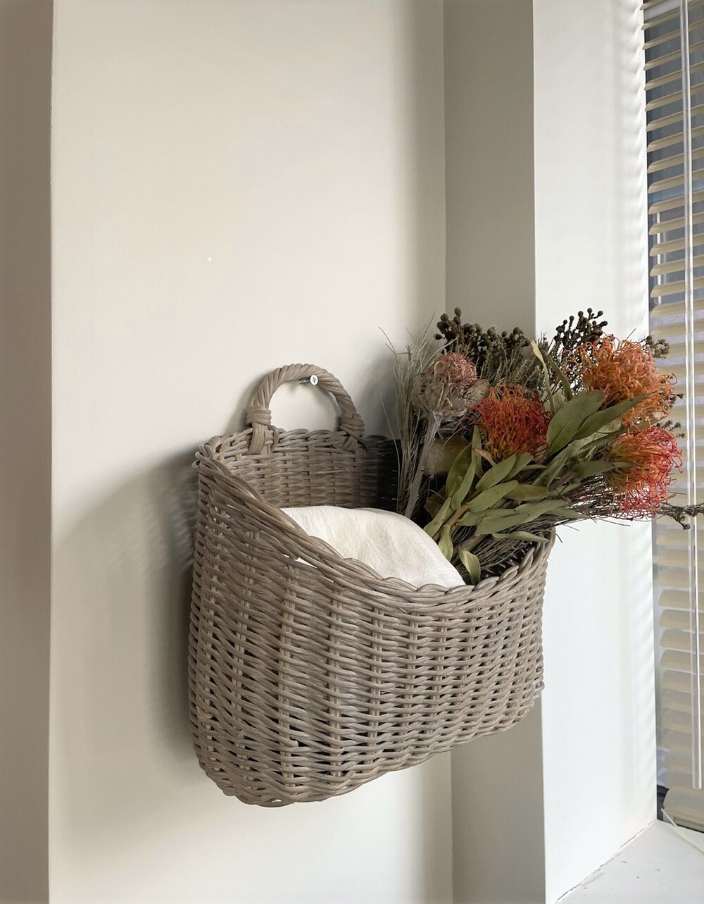 벽에 걸 수 있는 웜 그레이 색상의 작은 바구니입니다. 바구니 입구가 아래로 살짝 벌어져 있어 손쉽게 물건을 꺼낼 수 있게 디자인되었습니다. 현관에 걸어두고 마스크 혹은 키 홀더, 선글라스 같은 소지품을 담아 두기에 좋고 주방에서는 행주나 식재료 등을 넣어 두기에도 적합한 제품입니다. 그리고 덩굴식물을 담아 벽에 걸어 둔다면 멋스러운 화분 바구니로도 사용할 수 있습니다.