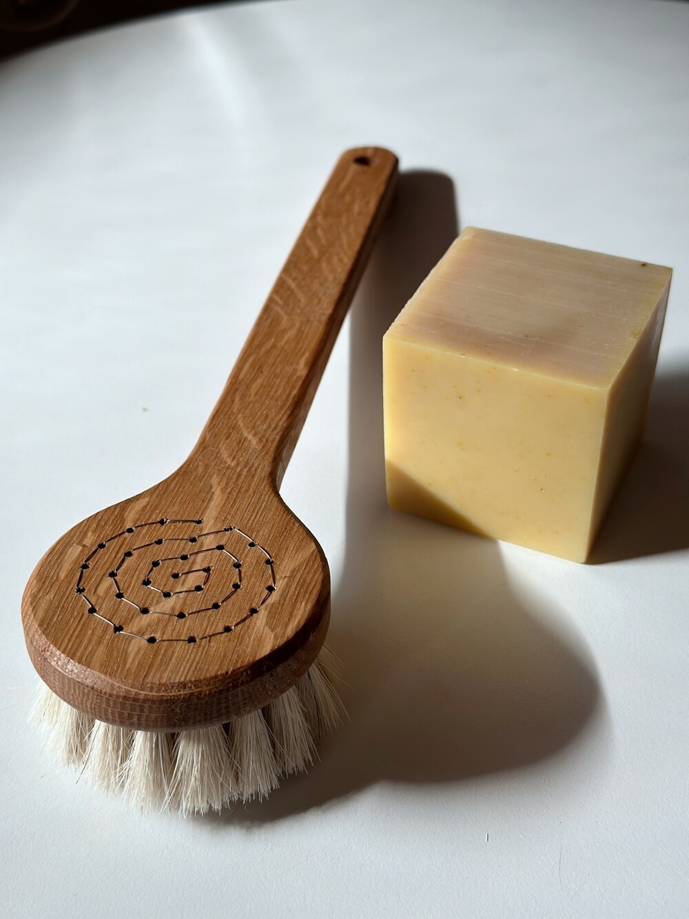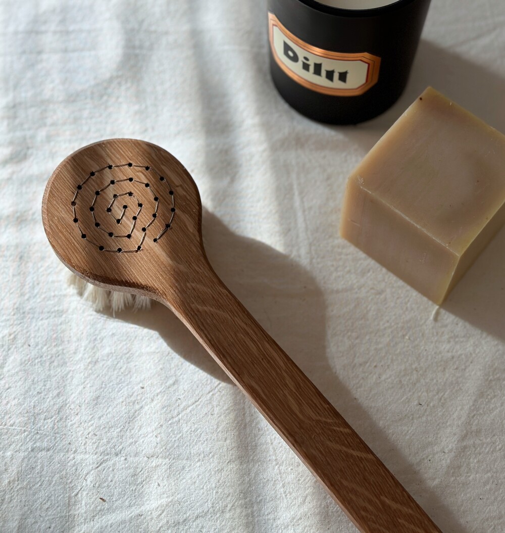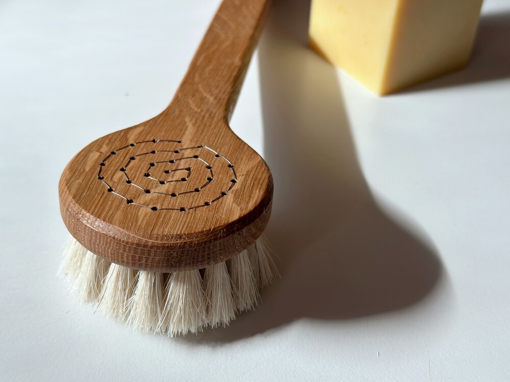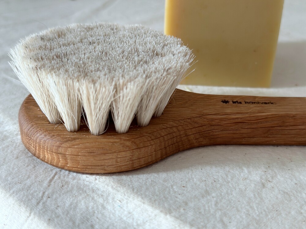 Bath brush in oak and horse hair. The long shaft makes it easy to reach your whole body.Let it dry standing on the brush or hanging so the water is transported away from the wood that is more sensitive to moisture.